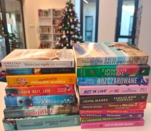 Na zdjęciu znajdują się nowe powieści obyczajowe, a w tle widać choinkę i regał z nowościami wydawniczymi/fot. E.M