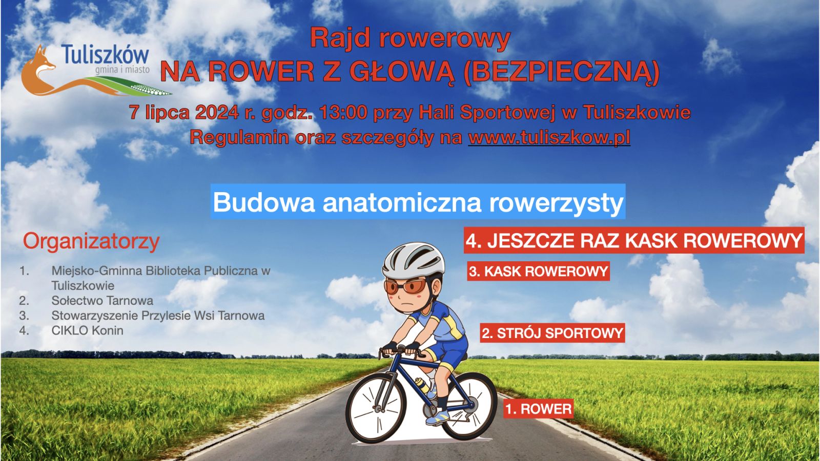 Zapraszamy na rajd rowerowy „NA RAJD Z GŁOWĄ (BEZPIECZNĄ)”, który odbędzie się 7 lipca 2024 roku (niedziela). 👉Zbiórka o godzinie 13.00 przy hali widowiskowo- sportowej w Tuliszkowie. 👉Trasa rajdu : Tuliszków – Wróblina – Wielopole – Piętno – Grzymiszew – Ogorzelczyn – Tarnowa. 👉Zapisy w Miejsko-Gminnej Bibliotece Publicznej w Tuliszkowie do 6 lipca br. (sobota) … Dowiedz się więcej