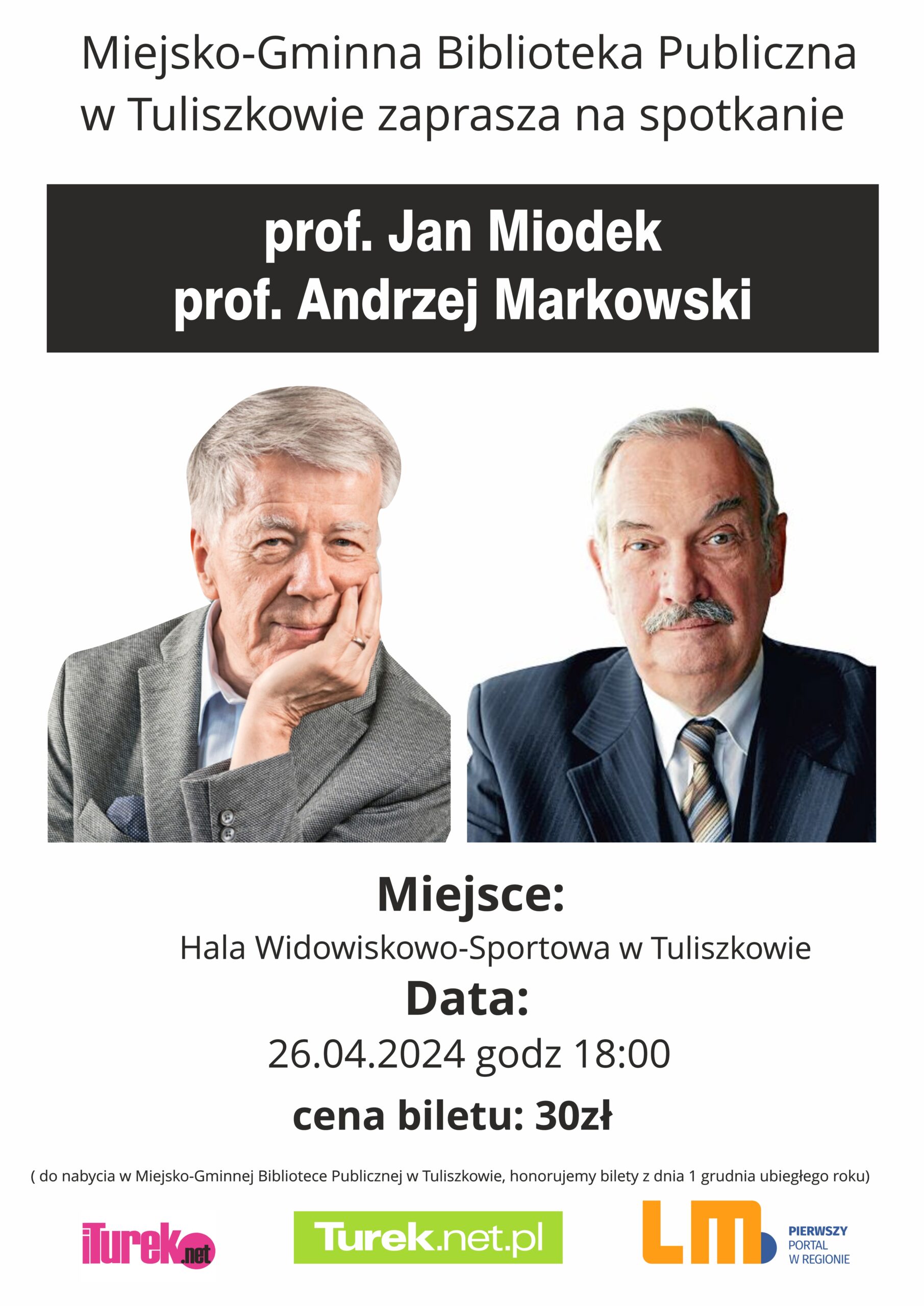 Zapraszamy na spotkanie z wybitnymi językoznawcami prof. Janem Miodkiem i prof. Andrzejem Markowskim, które odbędzie się 26 kwietnia br. o godz. 18:00 w Hali Widowiskowo-Sportowej w Tuliszkowie.